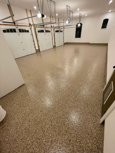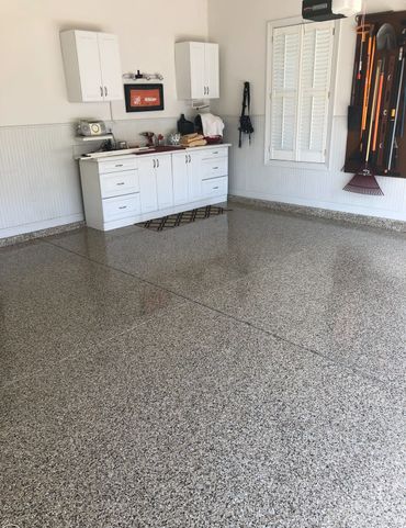 Patios are extremely popular areas for our signature "Chip/Flake" epoxy floor system. We use a UV-stable polyaspartic to ensure non-yellowing results!